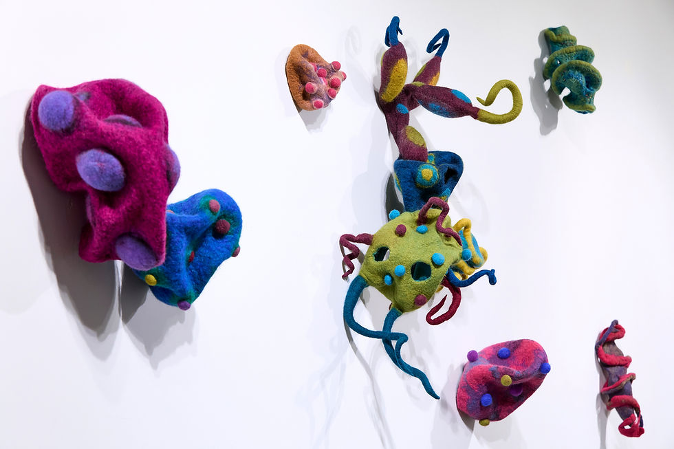A deeply fantastical artist, the fiber and installation works of Ann Vollum communicate themes on innocence, reflecting on the past, and the identity of home as well as a sense of adventure. These artworks encourage the viewer to relive their childhood fantasies and explore the hidden symbolism contained in mythological stories which can be revealed as both macabre and entertaining. These fiber and textile works are as joyful as they are disturbing representing a dichotomy between adult-and-childhood. The loss of innocence and attempts to relive a state of guiltlessness reveals a realm of escapism, a fantastical world created by Ann Vollum to have herself and the viewer explore planes of consciousness outside of our present and mortal selves.