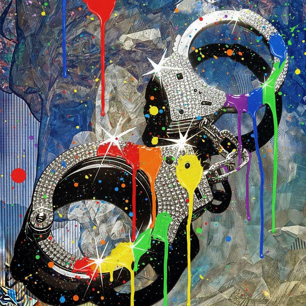 In all formats of Austin Lubetkin’s art, the figure or figurative elements are used to convey a nihilistic structure of luxurious excess through glitzy sparkles, pop-art-like colors, and centralized compositions reminiscent of graphic design trying to sell a product. These works have us question value systems and reveals the absurdity of contemporary versions of luxury, such as displaying a platinum, sparkling pair of handcuffs dripping with paint to a man being seemingly crushed in a motion blur of a giant stiletto fashion woman’s shoe. From lipstick escalators to a consistent vaporwave color schematic, Austin Lubetkin uses smooth surfaces and corporate as well as retail symbolism (such as barcodes) to reflect how individuality becomes erased through mass consumption and revolving our collective goals around attainment of superficial materialistic items. In essence, the art has us question value systems and implores the viewer to recalibrate their humanistic priorities against the excess and greed of retail.