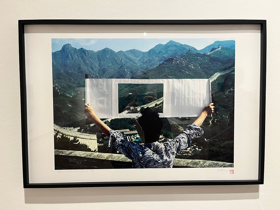 In “Scroll Series: Great Wall 1” (1979), a person holds the unrolled bamboo mat between their outstretched arms, and the square cutout reveals a part of the Great Wall of China, a picture within a picture. The transience of the image is emphasized further by the fleeting posture of the person’s outstretched arms holding the image. Eventually, they will have to lower their arms and the bamboo roll, as fatigue sets in. Thus, the chosen cutout is more ephemeral than the selected view of the bamboo branch in the open square of the roll stretched between the bamboo poles.