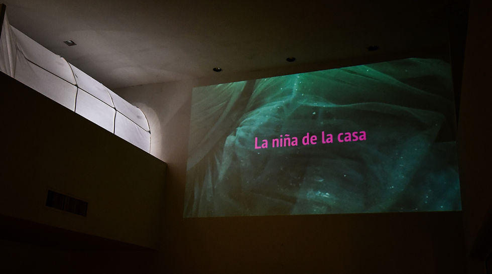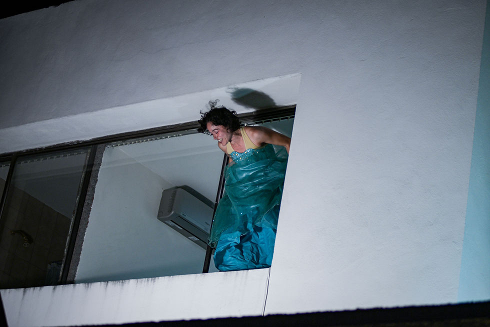 La Niña De La Casa, or The Girl in the House when translated to English, is a performance by Fina Ferrara which begins with a prelude to another performance titled Heartwork broadcasted to the audience. Heartwork entails Fina seated on the grass in a white gown stitching red thread through animal hearts in the mists of an ominous forest to spell the word ‘trust’. The theme of certainty in others becomes followed by Fina Ferrara being broadcasted to the audience live on a screen with a turquoise dress and engaging with a toy doll. A short time after, Fina breaks the fourth wall of the narrative by directly acknowledging the audience in the facility and proceeds to jump out of a balcony window. Fina then swings helplessly and joyfully from the bottom column of the balcony until she finally falls into a swimming pool within the courtyard.